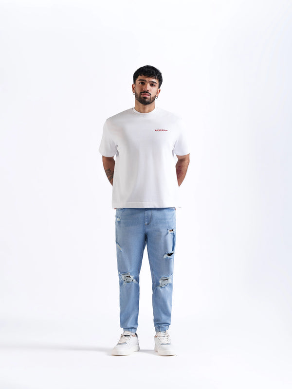 A raw take on comfort. These light blue denim joggers come distressed with a drawstring waist and a relaxed fit that keeps them effortless and versatile.